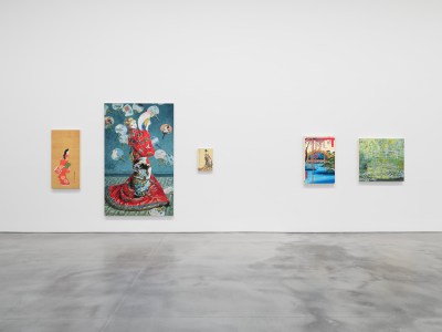 “Is that a real Monet?” asks a visitor to Takashi Murakami’s new exhibition at Gagosian New York, “JAPONISME → Cognitive Revolution: Learning from Hiroshige,” on view through July 11. The Japanese artist has subjected the French Impressionist to his characteristic screen-printing technique in Claude Monet’s “Water Lily Pond” And Me, Submerged in the Pond Like Gollum (2025), a slick copy that from a squinting distance might fool you. Conveniently, squinting distance is a popular suggestion for the best way to view Impressionism. Murakami knows his audience; he knows they are always looking at and through screens, and that the lure of the apparently famous now pulls harder than the onetime aura of originality.