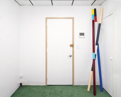 Within the UN, these emissaries’ words were of great importance, with the potential to impact the world more broadly. At Empire, their statements acted as background noise to the show, titled “Dress Code.” It consisted of little more than several poles, green carpeting, and the phones and speakers that played footage of live UN meetings. Samba procured the poles from construction companies, then painted them with colored bands of irregular sizes referring to national flags. One of them prominently featured red, white, and blue, which Samba said gestured toward “colonial powers,” the flags of so many colonizer nations sharing these hues. “I’m interested in color and power,” Samba said when I met with her in New York.