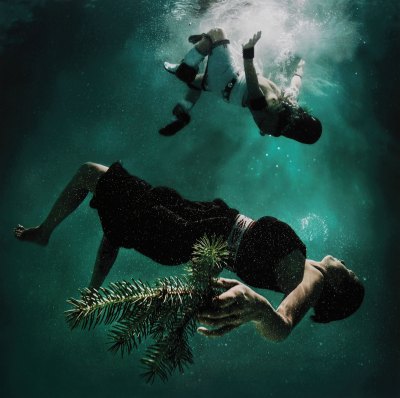But Romero also turns her lens on issues of climate change, specifically from an Indigenous perspective, like in Evolvers (2019) where feather-crowned children sprint across hot sand in a desert sprinkled with wind turbines. In Weshoyot (2021), Weshoyot Alvitre, who is dressed in traditional Tongva garments, floats in a deluge, cleaving nets that try to catch her. Her apocalyptic compositions cut through the distant, desensitized haze of “climate porn” imagery that often accompanies these discussions, according to Eve Schillo, a photography curator at the Los Angeles County Museum of Art. At LACMA’s “Nature on Notice,” Romero’s Water Memory (2015) depicts two traditionally dressed Native figures in free-fall through water. Their descent is neither escape nor surrender, but an act of survivance in which memory of the past lives of the land are carried forth. The dammed rivers that submerged their homelands are remembered within the context of the climate crisis that now threatens all waters.